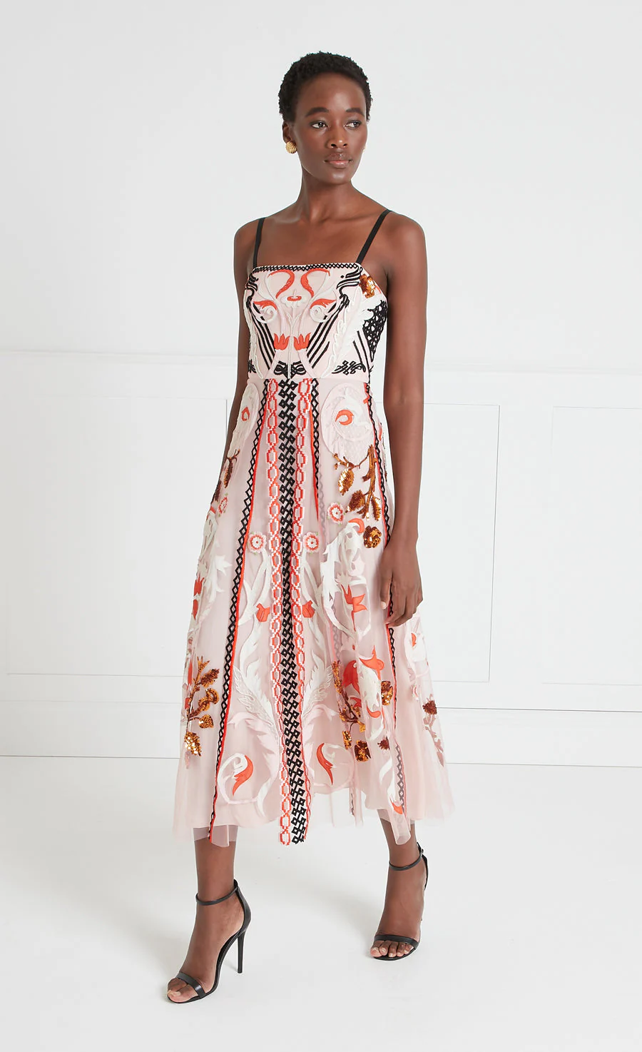 With a sharp, classical shape, the Alessia strappy dress cuts a strikingly elegant figure, with a neat square neckline, minimalist shoulder straps, cinched waist and layered mid-length skirt. Made from soft Italian tulle with fine hand-embroidered detailing, designed meticulously for the perfect fit, it feels playful and modern. Layer with the Alessia kimono for a truly stand-out look.