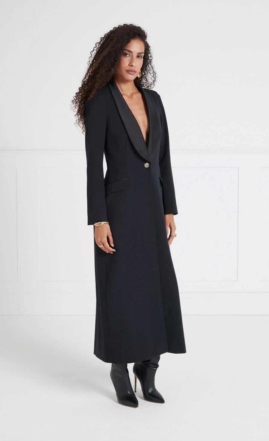 Sophisticated and sleek, the Enzo long coat exudes understated elegance with immaculate tailoring and impeccable detailing — a sculptural silhouette, plunging v-neck, lustrous shawl lapel and single gold-toned button fastening. Style with a knee-high boot or trousers as a two-piece.