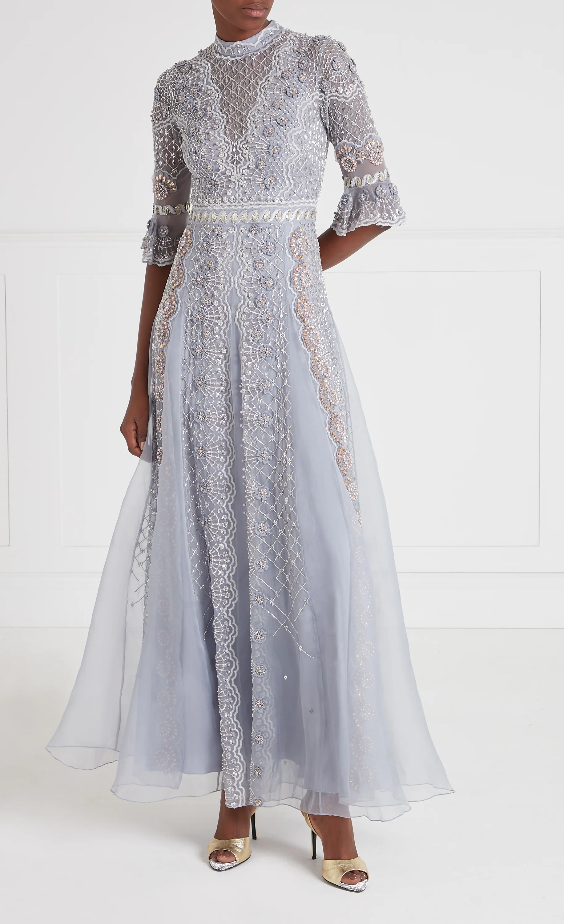 Translucent tulle features intricate embroidery, beading, and delicate lace, making this floor-length pale blue gown an ethereal show-stopper. The high neckline and fluted sleeves frame a fitted bodice, while subtle metallic and beaded details add a refined shimmer. A flowing skirt complements the elegant silhouette, ideal for evening occasions and formal celebrations.