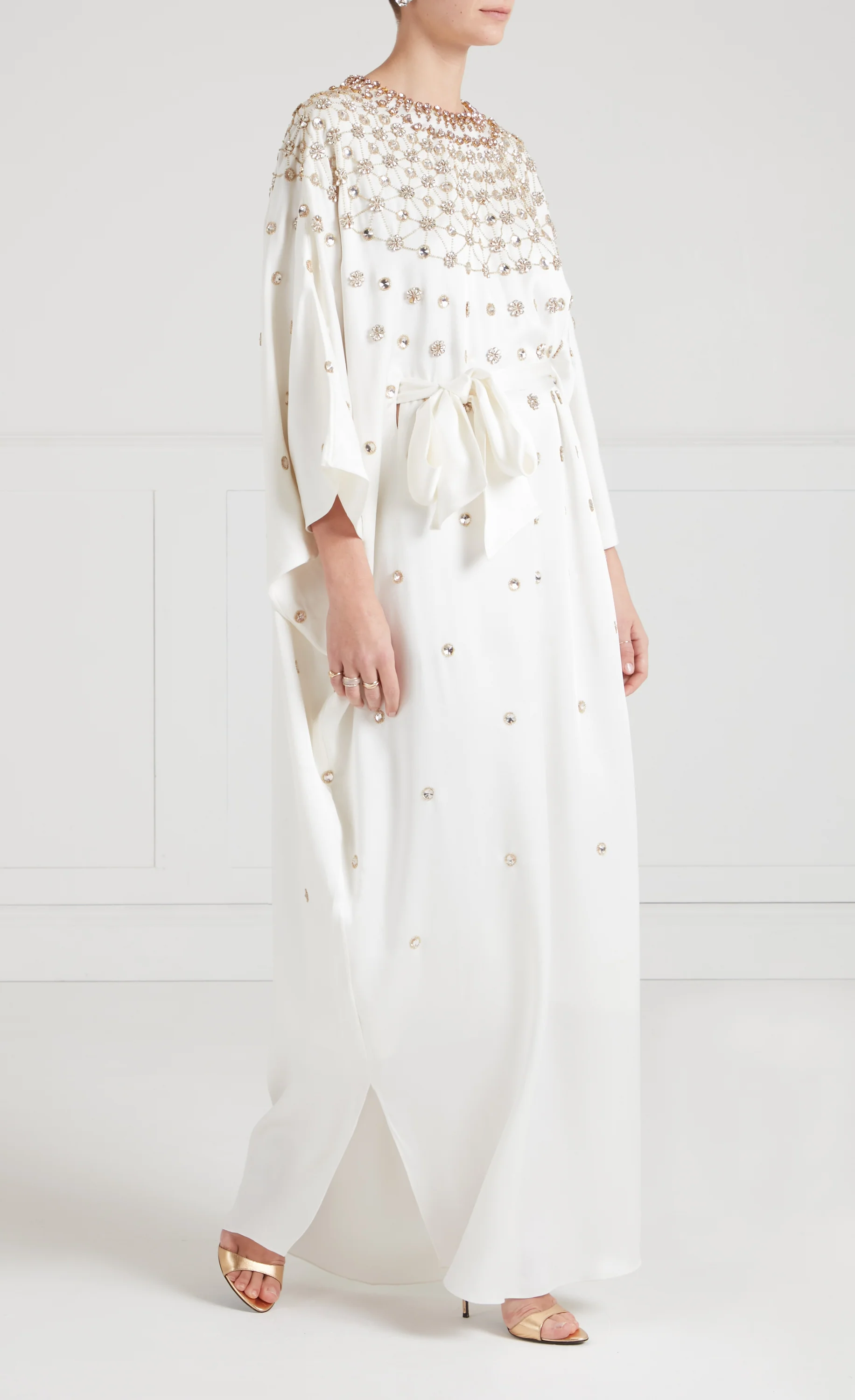 The relaxed, flowing silhouette of this floor-length white gown is accentuated by delicate gold embellishment radiating outward. A self-tie belt loosely cinches the waist, adding definition to the kaftan-style that is created with draping three-quarter sleeves and high-neckline.