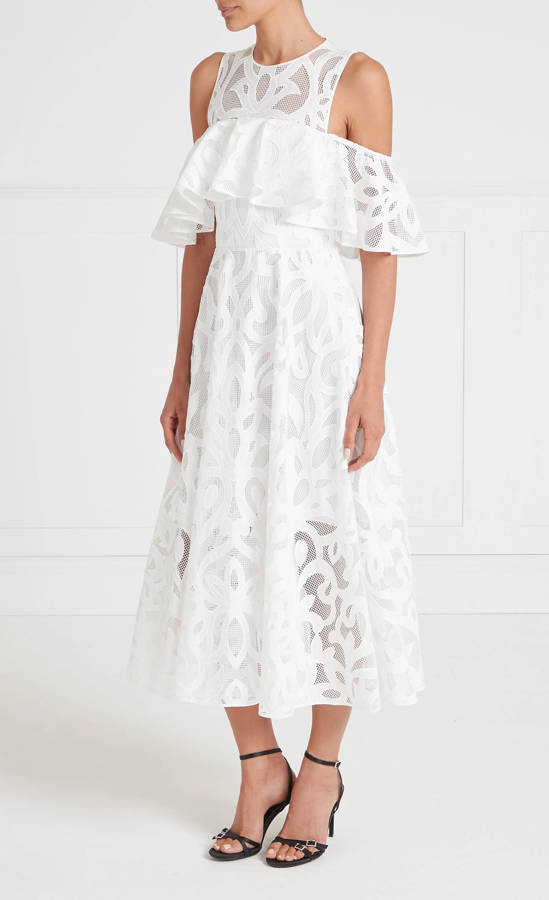 Ruffle detailing adorn the Louis Off-Shoulder dress, The open-shoulder design is paired with a fitted waist and flowing skirt, bringing a balance of femininity and grace.