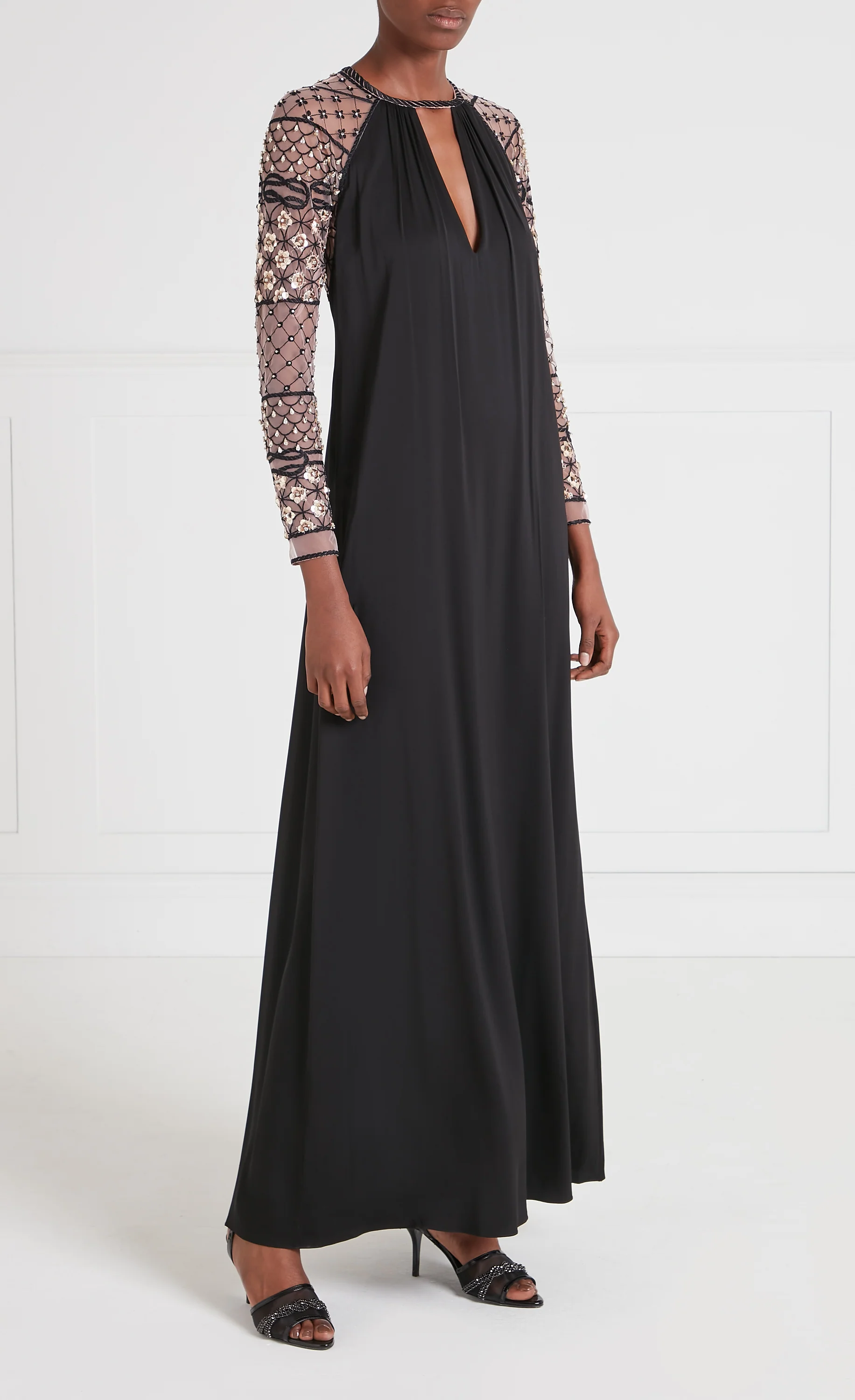 Combining glamour with intricate artistry, the black full-length Marie gown features sheer embroidered sleeves and back detail, cascading into a graceful, fluid silhouette.