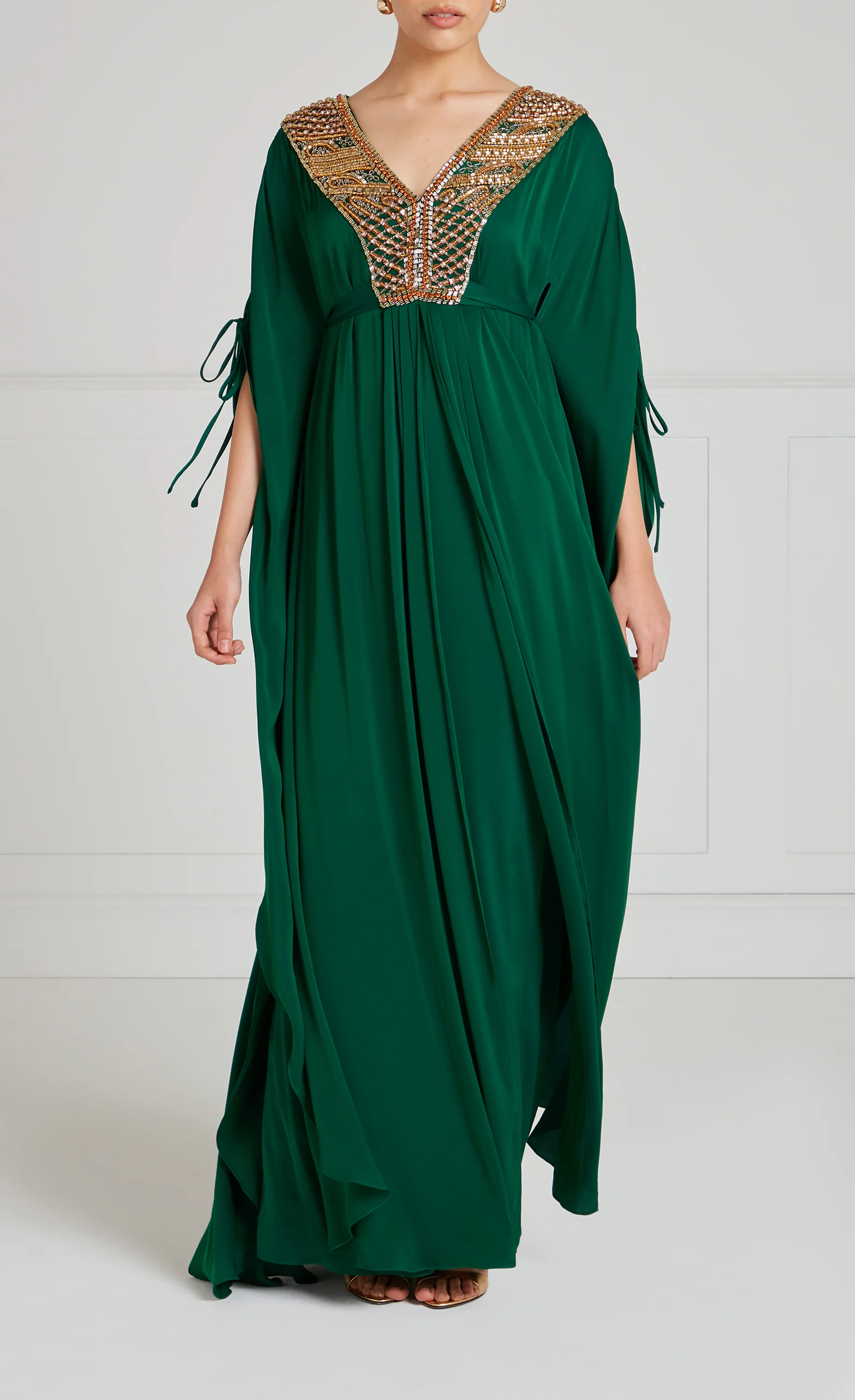An empire waist and ruched sleeves create an elegantly relaxed fit on this full-length green dress. A modest V-neck features intricate gold sequin detailing, giving structure to the airy silhouette for a dramatic evening look.
