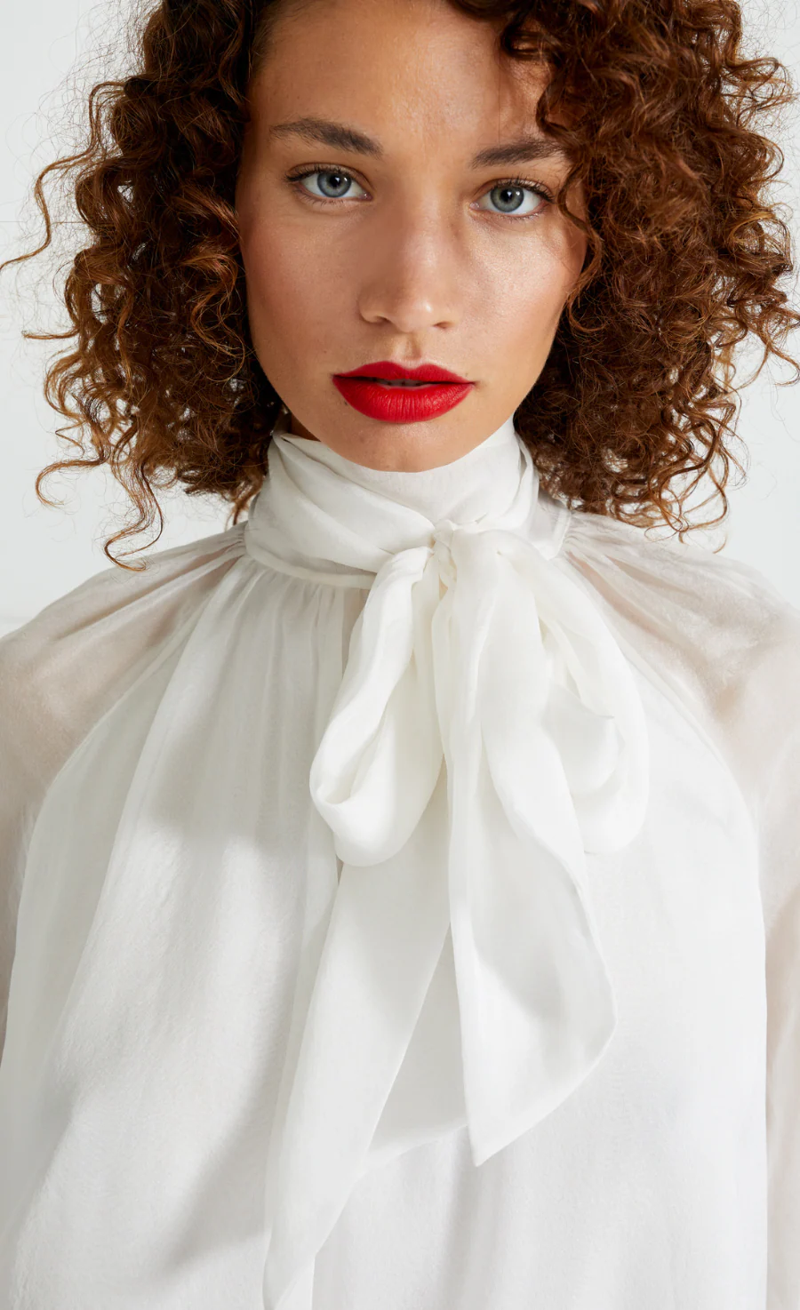 The Quintette Blouse in classic white makes a beautifully feminine addition to any modern wardrobe. Delicately crafted from silk crepe de chine, the blouse has a poetic quality. Its softly voluminous shape, blouson sleeves, smocked cuffs and bow serve to amplify the dreaminess. Balance the romance by pairing the Quintette Blouse with tailored Temperley separates.