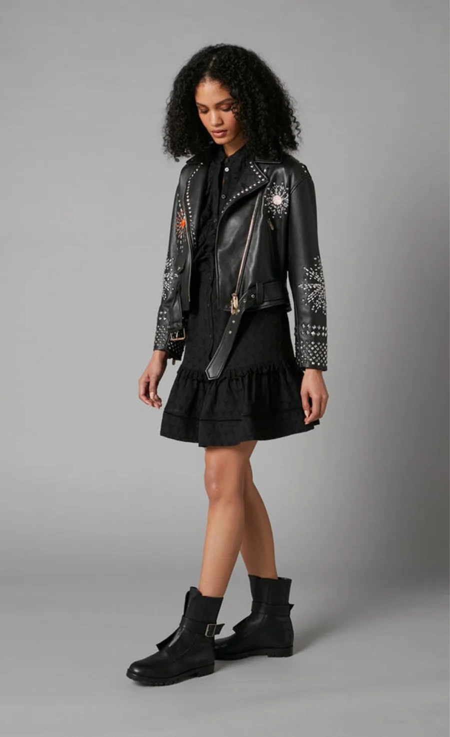 Cut from the softest black Nappa leather we could find, we've embellished the Rebel Leather Jacket with colourful studs and stitchwork. Inspired by vintage Japanese postcards of fireworks, these bursts of decoration play out in overlapping kaleidoscopic circles on the front, back and sleeves, sparking joy. The relaxed, oversized silhouette keeps the overall feel perfectly undone.