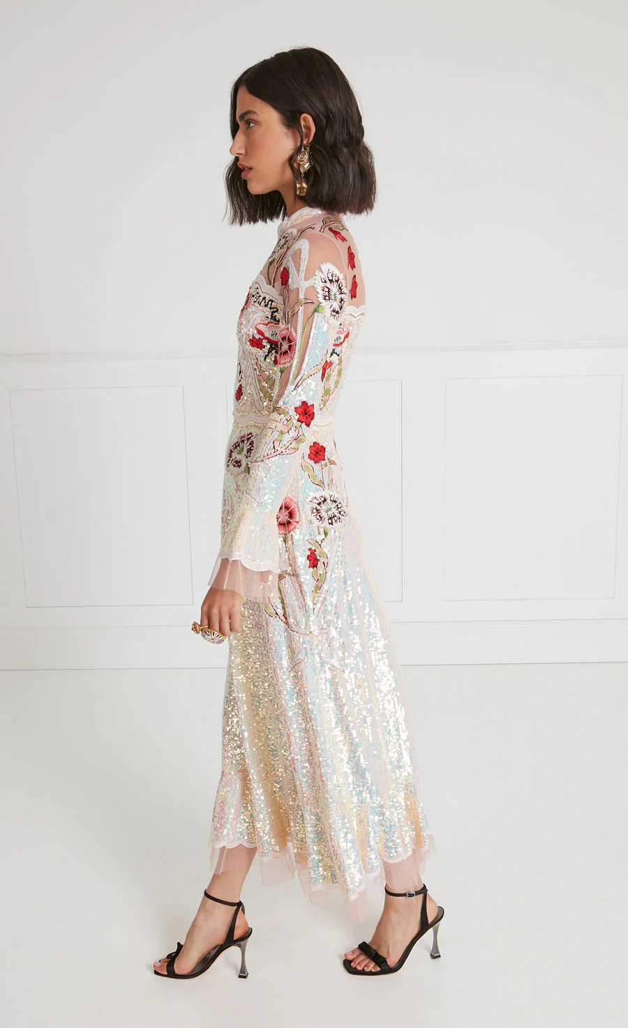 The Remi Midi Show Dress is a dazzling design combining signature embroidery with meticulous sequinwork, showcasing skilful appliqué carnations and floral motifs.
