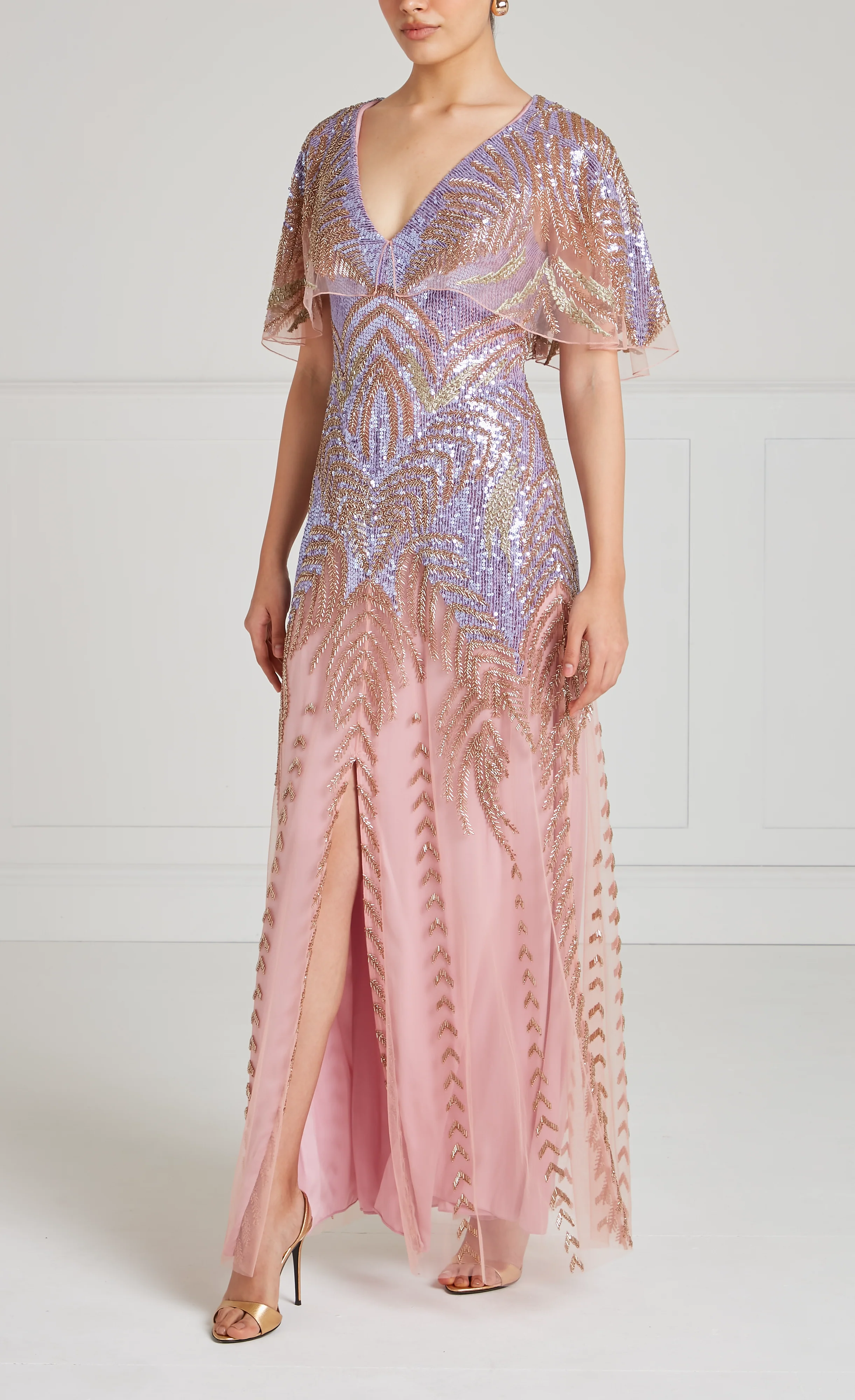 Blending metallic gold and lavender embellishments on tulle, this V-neck dress is light, airy, and elegant. With flowing short sleeves, the delicate patterning disperses down the silhouette to flattering effect, while the contrast of the sheer overlay and silk lining create an ethereal sense of movement.