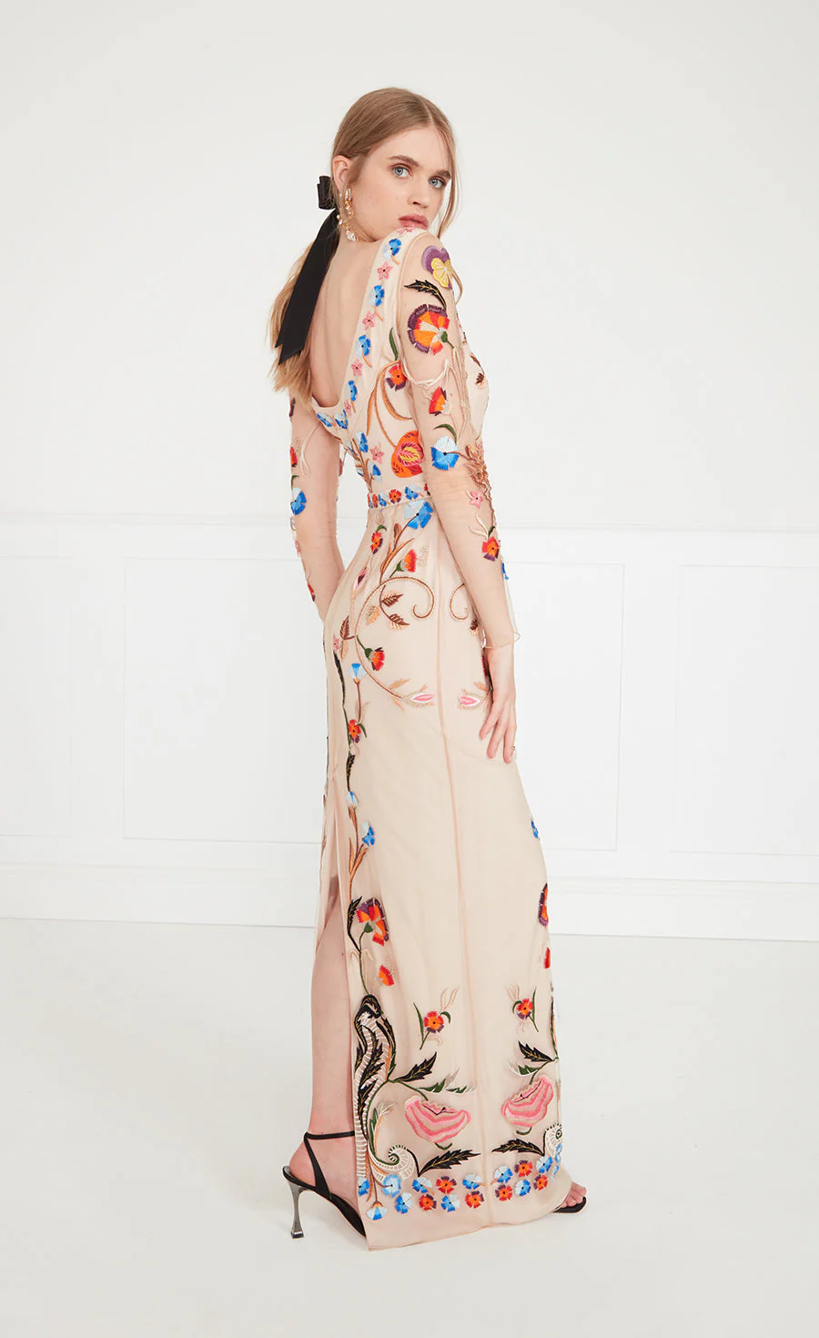 The Toledo Dress is at once timelessly Temperley and fiercely unique. This beautiful floor-length gown features delicately hand-painted florals in euphorically bright colours, creeping over sheer tattoo sleeves towards a nipped-in waist and slim fitting, floor-length skirt. A dress for the dreamer within.